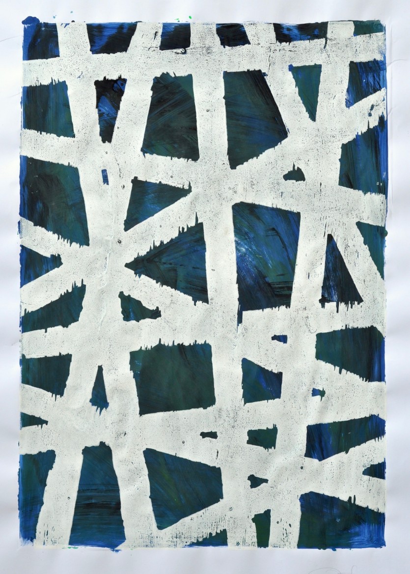 2014 aus der Serie "into the trees" Holzschnitt Mischtechnik auf Papier 100 x 70