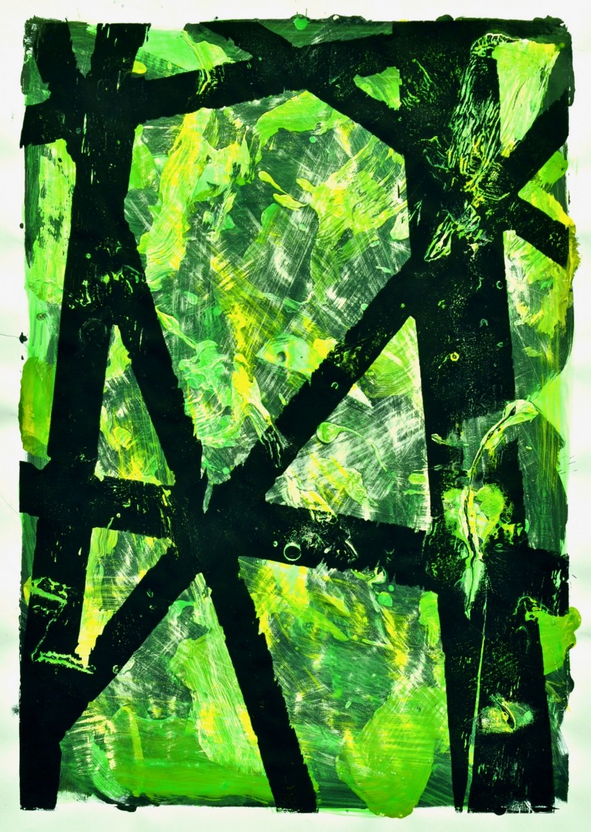 2014 aus der Serie "into the trees" Holzschnitt Mischtechnik auf Papier 100 x 70